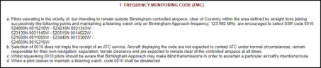 The FMC areas’ lateral limits are not marked on UK VFR charts but are notified by their coordinates in the relevant aerodrome/airport entry in the Aerodrome sections of the UK AIP at AD 2.22; an example for Birmingham Airport’s FMC area is at Figure 1. A chart depicting all the areas of UK FMC can be found in the UK AIP at ENR 6.80.