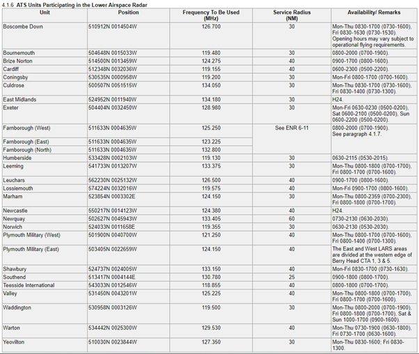 This guidance does require some flexibility especially with airfields which are proximate to other airfields or controlled airspace. The Designated Operational Coverage (DOC) of all ATSUs can be found in the UK AIP under the relevant aerodrome in section AD 2. LARS coverage including service radius, service area, and operational hours can be found in the UK AIP ENR 1.6 ATS SURVEILLANCE SERVICES AND PROCEDURES and a chart showing LARS coverage areas is also available at ENR 6-11 (see below).